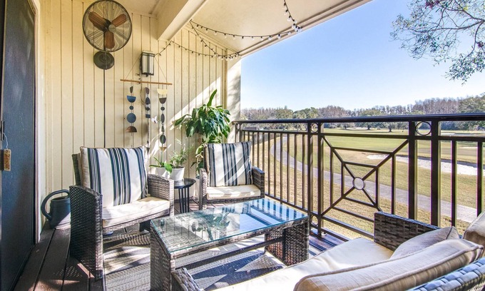 Matchless Luxury is exactly that - a designer renovated condo where all the special touches have been selected to ensure your stay is as perfect as it can be! From the soothing colors throughout the condo to the beautiful quartz and a pop of rose gold on the new Cafe appliances, you will be delighted to spend time in this kitchen! All the necessities will be at your fingertips! For dining options, you have the large quartz island that has seating for 3 and for more formal dining we have a glass table with seating for 4. The living area is inviting with plenty of seating on the leather sofa, loveseat or chair while enjoying one of your fav movies or series on the 65” Smart TV. The second floor walk-out patio has the perfect vantage point to view the golfers complete Hole #14 as you relax & decompress from a busy day! You will feel right at home in this condo! Entering the Master En Suite Retreat, you will find a King bed and lots of natural light from the corner window, 55” Smart TV and a beautiful tiled walk-in shower and separate dressing area. The guest bedroom is furnished with a queen bed as well as 2 X-large twin bed bunks, a desk & chair with a fun Florida vibe with a 55” Smart TV. The guest en suite bathroom has a beautiful tiled bathtub/shower & toilet area. Evening time is the perfect chance to relax out back on the patio and enjoy the end of a great day!