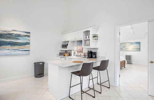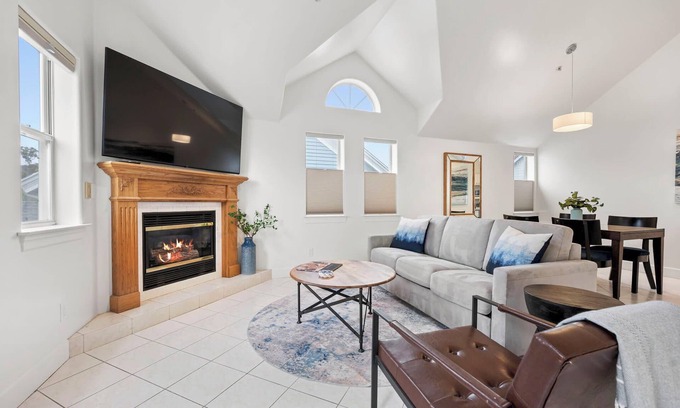 Located above Main Street in the heart of historic Half Moon Bay, the Mavericks Penthouse is a luxurious, high-ceiling retreat offering comfort, style, and signature coastal charm. This expansive suite features a plush king-size bed, a spa-inspired bathroom with a walk-in shower, separate WC, and double vanity sinks. The bright living area invites you to unwind with a cozy fireplace, flat-screen TV, and a comfortable sofa bed. A convenient kitchenette includes an under-counter refrigerator, a single-element black induction cooktop, blender, kettle, toaster, coffee maker, microwave, and basic kitchen essentials. Step out onto your private back deck—an ideal setting to enjoy morning coffee or evening wine while savoring the fresh coastal breeze and the relaxed atmosphere of downtown Half Moon Bay.