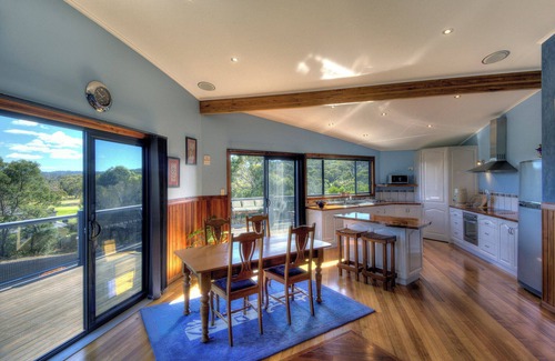 This holiday house has 3 spacious bedrooms and 2 bathrooms. The main bedroom opens out onto the deck and has a lovely view of trees and the golf course.