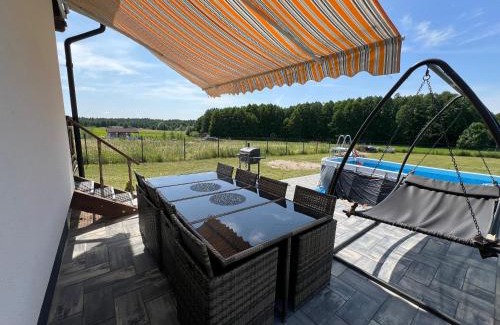 Offering a garden, Mazurska Sielanka provides accommodations in Orzysz. This property offers access to a balcony and free private parking. The vacation home features an outdoor swimming pool and a shared kitchen. Featuring a terrace and lake views, the vacation home includes 5 bedrooms, a living room, flat-screen TV, an equipped kitchen, and 1 bathroom with a hot tub and a shower. Guests can take in the ambience of the surroundings from an outdoor dining area or keep warm by the fireplace on colder days. The accommodation is non-smoking. For guests with children, the vacation home offers outdoor play equipment. With an outdoor fireplace and a picnic area, this vacation home offers plenty of opportunities to wind down. Talki Golf Course is 5.4 miles from Mazurska Sielanka, while Boyen Fortress is 22 miles from the property. Olsztyn-Mazury Airport is 66 miles away.