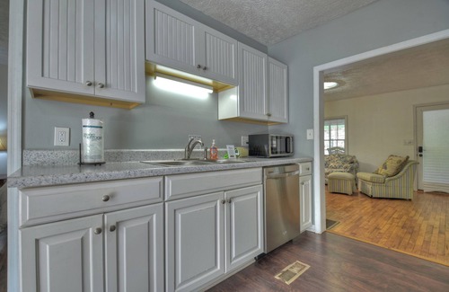 McCaysville River House is a rare find on the banks of the Toccoa River! This unique and newly remodeled river cottage has a front porch with wicker porch furniture, windows all around, the living room has a comfortable sleeper sofa, love seat, and 48” TV with cable. The house also boasts 2 King Bedrooms; all one level living! Outside the dining room is a large deck with an outside table, a wood-burning fireplace and lots of comfortable deck/lounge furniture right on the banks of the river.