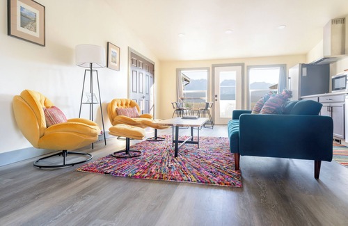 This apartment sleeps up to four guests with a queen bed in the master bedroom, which has an awe-inspiring view and sitting area; a queen bed in the second bedroom; and a fully updated bathroom with tub. The outside comes inside with a large pane window looking directly out to the view. Enjoy the amenities of a large kitchenette, a lawned outdoor seating area, and a private deck with an outdoor table, both perfect for enjoying the unobstructed views of the Sawtooth Mountains.