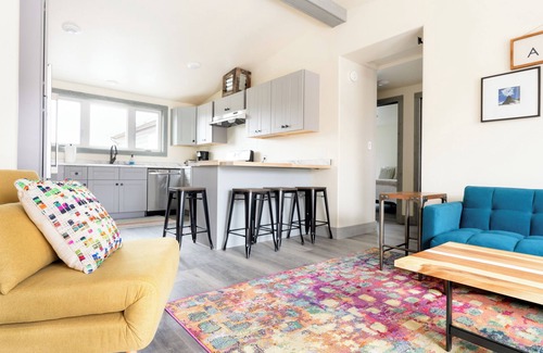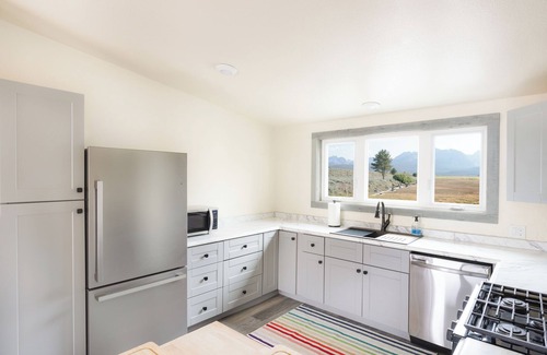 Our delightful apartment sleeps up to four guests, with a queen-size bed in each of the two bedrooms and a fully updated bathroom. Enjoy the amenities of a full kitchen, including an oven, range, dishwasher, and full-size fridge. The outside comes inside with a large pane window looking directly out to the view. There is a lawned outdoor seating area and a private deck with an outdoor table, both perfect for enjoying the unobstructed views of the Sawtooth Mountains.