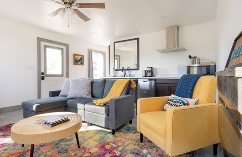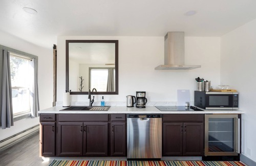 Our fully equipped apartment has a queen-size bed in the master bedroom and a sectional in the living room. The outside comes inside with a large pane window looking directly out to the view. There is a shared lawn outdoor seating area perfect for enjoying the unobstructed views of the Sawtooth Mountains.