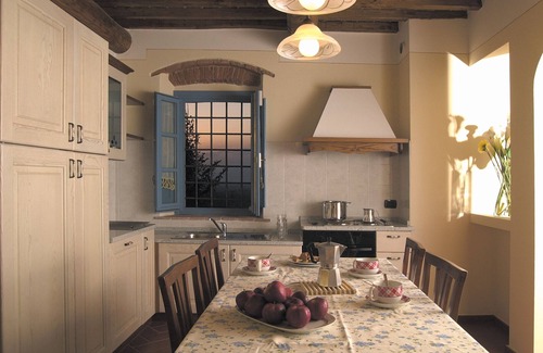 The house is very spacious and has been divided into large and elegant apartments offering 17 bedrooms and 9 bathrooms ideal to accomodate large groups up to 33-36 people .The property has been completely restructured in full respect of the Tuscan architectural style, with the handsome façade in bare stone, the door and window frames in grey sandstone, the roof ventilated with modern technology but made using the ancient tiles, the interior floors in classic red terracotta, the ceilings with great beams in chestnut, oak and cypress, or beams in antique terracotta, the plaster walls tinted in pale hues, the stone stairways, and the original frescoes that decorate some of the ceilings. Community area with oven, grill and a zone equipped with tables and benches for outdoor enjoyment. Large arcade to enjoy meals all together , a professional kitchen to cook yourselves for a large group , panoramic pool and a heated hydromassage pool for 6/8 adults set amid olive trees.