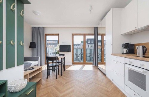 This unique 25 m² studio has been designed for people who value modern style, comfort and clever use of space. Ideal for both short stays and longer rentals, it combines functionality with a cosy, homely atmosphere. The interior exudes peace and elegance - dominated by bright, natural colours that optically enlarge the space and create a relaxing atmosphere. In the lounge area there is a sofa bed, which serves as a comfortable place to rest during the day, and in the evening it easily turns into a bed ensuring a comfortable sleep. Next to it is a table with chairs, which is great both as a place to work and for eating meals. For lovers of relaxation, there is a TV with the Smart TV function and access to Internet TV, allowing the use of streaming platforms and online channels. The kitchenette has been fully equipped with modern appliances that will satisfy even the most demanding users. Guests have at their disposal an induction hob, oven, dishwasher, as well as a coffee machine and a set of dishes and cutlery, everything necessary to prepare and eat a meal in comfortable conditions. The bathroom is decorated in a modern style, with high-quality finishing. It has a spacious shower with a glass cabin, a sink with a large mirror and a washing machine, which allows for independence during longer stays. An additional advantage of the apartment is a parking space, belonging to the apartment and located on the premises of the building.