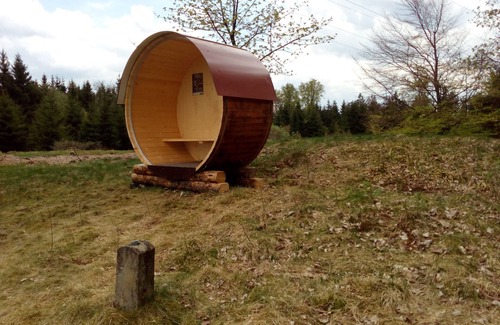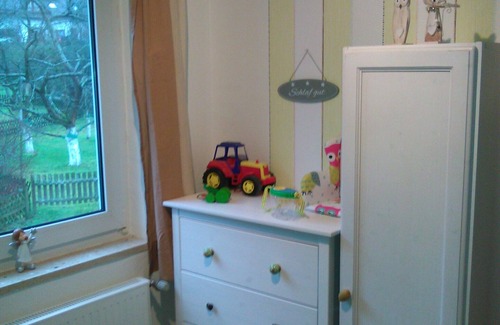 Our apartment is about 77 square meters and 2015 was equipped with a new bathroom, new living room, dining area and many nice details. There is a master bedroom with changing table and if needed a cot available. In the nursery is a new loft bed, as well as some toys for all ages to find. The large kitchen invites you to linger at the large dining table. From the newly furnished living room they look into the 1200 m² garden which is located directly on the stream. In the garden you can have breakfast, bake bread at the campfire or just relax while looking at the surroundings, the forest and the meadows. The house is located in the outskirts. Your children can learn a lot here. They experience a new adventure every day. Whether scavenger hunt in the village, a visit to a turnery in Girkhausen or milk at the farmer ... In our garden, the children are also allowed to camp ...