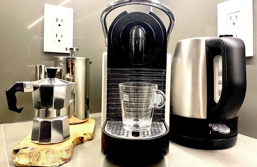 Full kitchen with Bosch induction cooktop, Breville smart oven, fridge, sink, cookware, plus coffee station with Nespresso, French press, and milk frother. A/C, Wi-Fi, washer/dryer, beach towels, yoga mat, reading materials, and a custom Argentinian grill make your stay effortless.