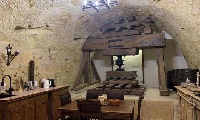 Here you are reading about Michelangelo, a fabulous 140m² 2 bdrm 2-1/2 bath, part troglo/part traditional house, which sleeps up to 8 people. The master bedroom has a bed for two and a single bed, the living room has a very comfortable sleeper-sofa, the charming attic bedroom has 3 single beds, it is accessed by a very steep space-saver stair. There is access to the higher terrain from the top floor, but that is an unprotected cliff. There is a large kitchen/dining area with an amazing display of an ancient winepress. The kitchen has a full size refrigerator and freezer, four burner electric stove top, electric oven, dishwasher and small appliances. There is a shower in the downstairs bathroom, a bathtub in the upstairs bathroom, and a powder room at the top of the stairs for the attic bedroom. There is a small laundry with clothes washer and dryer. The TV has internet and Netflix, there is free high speed WIFI. You have a private patio with a barbeque and your own indoor parking.