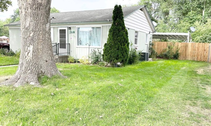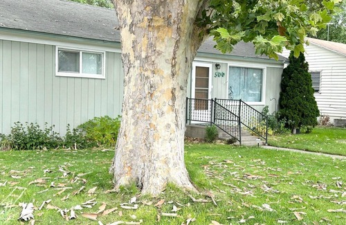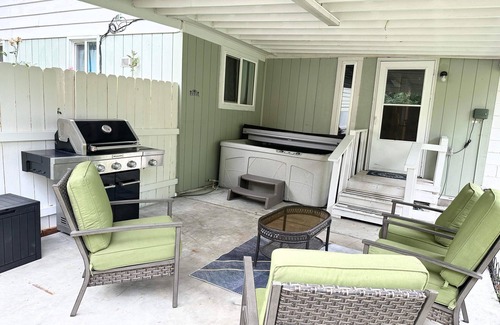 The back patio has chairs and a table for snacking or playing games. A natural gas grill with utensils, a corn hole set, and the black box if full of smore's utensils and wood for the fire pit. Enjoy the private hot tub and yard for you and your family or friends to relax and play. WE HAVE SECURITY CAMERAS…. One in the front yard that shows street parking, front yard, part of the side, parking, and front door. One in the back yard that shows, the back door, most of the backyard, the back shed, most of the fire pit, the hot tub, and back patio area.
