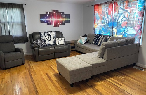 Spacious Music themed house w/private hot tub, corn hole set, & grill outside. Make memories in this unique & family friendly home. 2 bedroom+extra office/sleeping area W/out door or window. 6 beds+3 more sleeping areas..