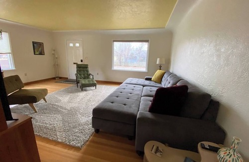 2 bedroom/1 bath home with fenced in back yard and plenty of natural light. With Mid-century modern furnishings, this home is the perfect place to settle in to Missoula. The large sleeper sectional is great for relaxing and watching TV or use it for extra guests. Each bedroom has their own dressers and closet space and comfy queen beds.