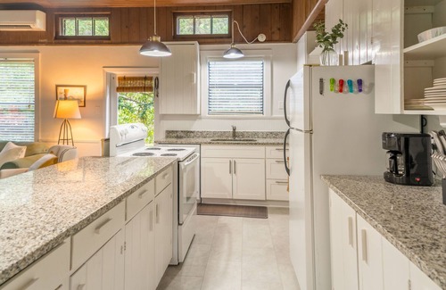 A 1950's old-school experience! The living room has high wood ceilings that create a classic yet modern feel. The fully equipped kitchen and dining area invite shared meals, and the private patio surrounded by lush greenery. Nestled in a Floridan paradise, minutes from downtown, restaurants, and short drive to the beach.