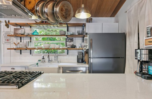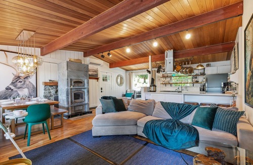 Welcome to Woodland Waterfront Retreat, where modern comfort meets natural serenity. Nestled amidst towering trees on the shores of Beaver Lake, this exquisitely renovated midcentury modern home offers an idyllic escape for up to six guests.