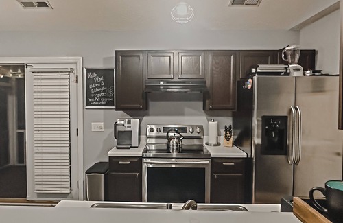 Perfect location! Home is conveniently located midway between Wrightsville Beach and downtown Wilmington with extremely easy access to both. Open floorplan with two bedrooms and two full baths with a third bedroom converted into an office space. Home has two dedicated parking spots and a private fenced in back yard. Enjoy a beverage in the screened in back patio before heading out for the evening. Amenities include three TV's, washer, dryer, coffee, pressure cooker, air fryer etc.