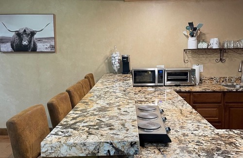 —The kitched area includes 6 barstools + a large round table with seating for 8 more people + 1 high-chair. The kitchen also includes a mini fridge, dishwasher, counter top convection oven/air fryer, microwave, 3 plate electric burners, coffee machine, and other basic kitchen essentials.