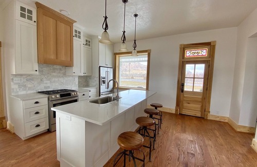 The Millsite House was built by the Nelson Family in 1895, it has recently been restored and renovated to offer guests a unique experience and comfortable stay. The home is nestled in the middle of a working farm surrounded by breathtaking views. Historic details have been restored and preserved in hope of instilling a greater appreciation for our pioneer ancestors. The beautiful new kitchen with stainless steel appliances and large quartz island is stocked and fully functional with high end cookware, dishes, microwave, gas range and more. Dining room has a large farm style table with additional seating. The parlor is breathtaking with large windows, victorian furnishings and working gas fireplace with original mantle. The utility room has a washer and dryer and main level bathroom. The charming wood staircase leads to three bedrooms that sleep eight comfortably and two more bathrooms. The master bedroom has a king bed, 55 inch television and private bathroom. All bedrooms have clean high quality bedding. Dual heating and air-conditioning and high speed wifi all add to ensure a comfortable stay.