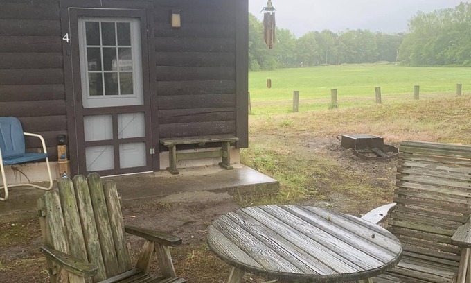 50 acres just miles away from Ocean City & Assateague. Mini Cabin 4 sits on the lake and will be the 4th cabin you see. It has 6 single bunks, Air conditioning, Mini Fridge, Heater, 2 Electrical Outlets, A table and Chair. Outside has a table with chairs with a wood cooking firepit. The bathhouse is a short walk away across the bride with flushable toilets and hot showers. Volleyball Court, Horse Shoe Pits, Hiking trails.