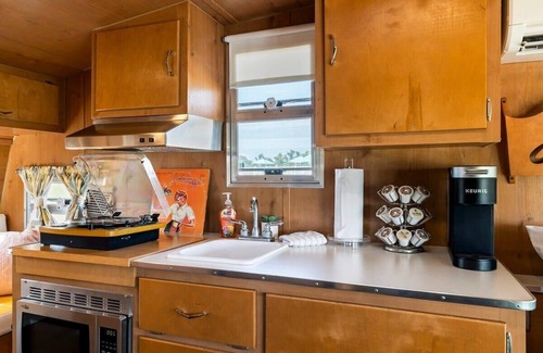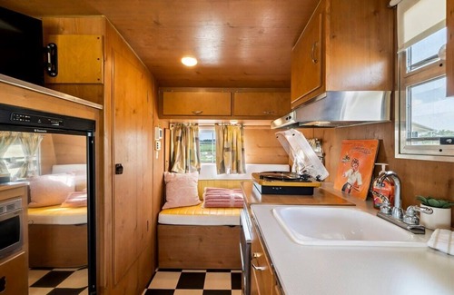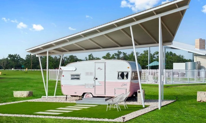 Treat yourself to a peaceful, fun-filled glamping getaway with Miss Lottie, a reissued 1961 Shasta that's part of the Palm Springs-inspired Blue Skies Retro Resort. This resort has everything you need to unwind, including fantastic vintage decor, an outdoor community pool, a shared gas grill, and a pavilion with an outdoor fireplace. Enjoy a separate, private bathroom suite, complete with a bathrobe, and rinse off under the vast blue Texas sky in your very own outdoor shower.