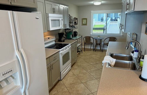 Inside, large windows frame those breathtaking views, filling the condo with natural light. Kick back in the living room with a good book or catch up on your favorite shows on the flatscreen TV. For extra guests, the couch (not a pullout) is ready to accommodate. The fully-equipped kitchen is perfect for preparing your favorite meals, with a four-person kitchen bar for casual bites and a six-person dining table for gathering. A cozy breakfast nook for four also doubles as the perfect spot for family game nights.