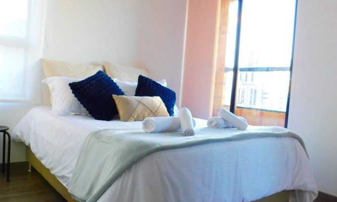 Enjoy a modern apartment on the 13th floor with an impressive panoramic view of Bogotá. Designed for comfort and convenience, the apartment features one bedroom with a double bed and a closet with hangers. There is a cozy sofa bed in the living room as well as a table and chairs. The flat also has a fully equipped kitchen. It includes 1.5 bathrooms (one complete with a shower), a washing machine, and a smart TV with high-speed Wi-Fi. There is a private balcony.