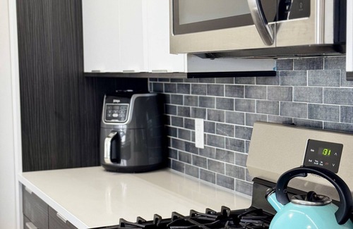 Discover this modern 1-bedroom apartment just 1 block from the NYC bus stop and 25 minutes from Port Authority. Enjoy high-speed WiFi, a smart TV, a sleek kitchen with stainless steel appliances, and an in-unit washer & dryer. Relax on the rooftop lounge with breathtaking NYC views. Steps from top restaurants, cafés, and shops, this short-term rental is perfect for travelers, business professionals, and couples seeking comfort and convenience near New York City