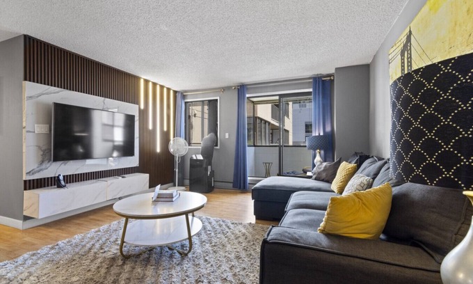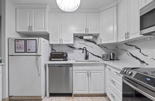 Recently renovated with new flooring, quartz counters and new furniture. All the kitchen utensils needed for feeling at home away from home. Moen touchless kitchen faucet. High pressure rain-like showerhead. Open balcony to watch Stampede fireworks from comfort of the couch. New 60" 4K UHD Smart tv in living room.