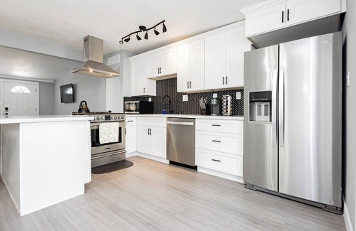 Enjoy a bright, open-concept living area with plenty of seating, a kitchen island with stools, and a dining area that seats four. The modern kitchen is fully stocked with cookware, utensils, cutlery, and more — everything you need to cook and entertain in style.