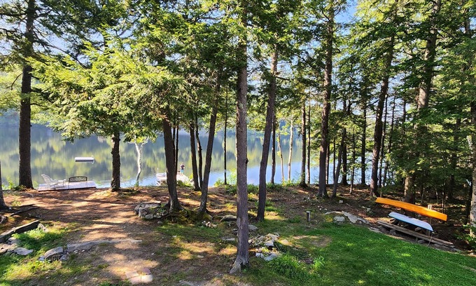 With 4 bedrooms (2 upstairs [king & double] and 2 at ground level [two twins & queen]), a futon sofa in the ground level, and 2.5 baths, there is plenty of room for up to 9 people. The ground level also offers beautiful views of the lake from its 4 large windows and sliding glass door. The 2 story configuration provides a layer of privacy for that second family, or the kids, to wind down and enjoy board games, the snack nook, and the second living area after a day in the sun, before an evening of s'mores around the campfire. The house is well stocked with linens, utensils, a grill, cooking appliances, cookware, a washer and dryer, and 3 large screen TVs to create a stress-free vacation. Our lakeside home is air conditioned (AC) and located down a quiet private dirt road that is a quick ride to town for lunch, an ice cream, supplies and other larger lakes, such as Long Pond, Great Pond and more!