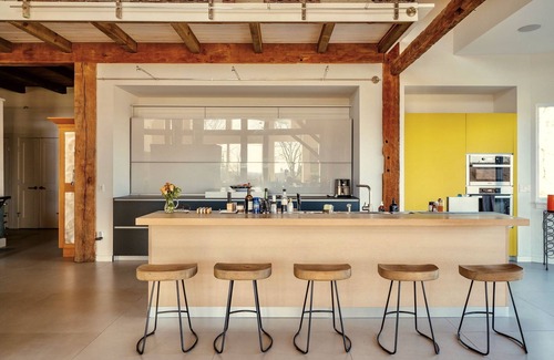At the end of a winding, tree-lined road, hidden from sight by towering pines and the gentle curve of the landscape, a clearing opens and the Bantam Barn comes into view. Set high atop a hill and surrounded by nearly five acres of quiet woodland and lawn, this remarkable home is not merely a place to stay, but a place to exhale. Originally a 19th-century barn, the structure has been lovingly reconstructed and reimagined as a warm, design-forward retreat. Reclaimed barnwood, antique hand-hewn beams, and wide-plank floors bring a sense of age and authenticity, while soaring ceilings and modern finishes lend lightness and ease. The architectural language is tactile, timeless, and deeply connected to its surroundings. The heart of the home is its great room-a breathtaking open space anchored by a floor-to-ceiling fieldstone fireplace. Sunlight pours in through expansive windows, blurring the boundary between indoors and out. Every detail here has been thoughtfully chosen to balance rustic texture with quiet luxury. The kitchen strikes a sleek, contemporary note with integrated appliances, an induction cooktop, and a massive island that invites both meal prep and lingering conversation. It's open to the dining area and living room, creating a natural flow that is ideal for entertaining or simply spreading out. Just beyond, a sunken den offers a more intimate space for movie nights or reading by the fire, tucked away, yet connected