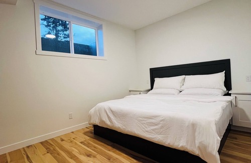 Discover this stylish and thoughtfully designed basement suite, perfect for a relaxing stay. The bedroom showcases a contemporary aesthetic paired with functional, custom-built storage. The bathroom is equipped with sleek finishes and a high-quality vanity with elegant gold accents. Located just a 10-minute drive from downtown, this suite is ideal for both business travelers and vacationers. Enjoy a comfortable, private space with all the modern touches to make your stay unforgettable. Book now for your next getaway! There is no wifi at the property currently.