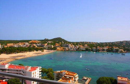 Spacious apartment (110 m2) with great balcony and a large shared pool. All renovated, modern, clean. Three bedrooms with ceiling fan AND air-condition. Two modern bathrooms with daylight. Two satellite TV's (living room and master bedroom). Great view overlooking Santa Ponsa and the bay. Lift # 1 brings you to the pool area. From there you have direct access to the lower front building where lift # 2 takes you to the promenade with all kinds of shops, restaurants and bars. Award-winning Santa Ponsa white sand beach is only 5/10 minutes away. All facilities (Cafes, WC, Medical Aid, Lifeguards,Lockers,) are available there. The beach area is separated from the promenade by shady pine trees.