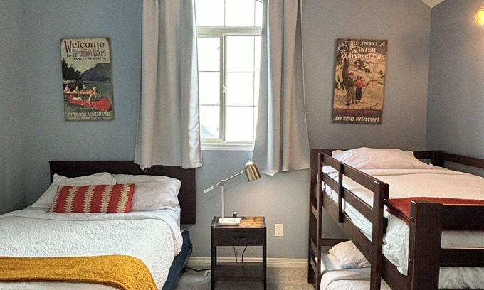 Beautiful Upscale Cabin vibe! All the charm of cabin living; high end details of a Boutique hotel. Newly renovated and updated with designer touches. Bunk bed added in second bedroom along with double bed. Perfect for your next mountain getaway. Enjoy a private entrance; largest outdoor, year-round heated pool and hot tub in Canmore; walking distance from restaurants, shops and adventure.