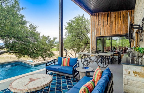 Modern charmer with gleaming lake views, pool, fireplace, & grill - dog-friendly | House in Burnet