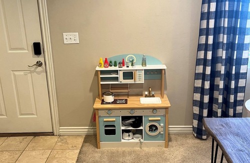 Stunning basement apartment. The open space has everything you will need including an Air Hockey Table! Beautiful full kitchen, 2 bedrooms and 1 bathroom, laundry and a huge, beautiful family room. Whether you are gathering as a family, visiting the area or escaping for time away - this is the space for you! 25 min to Sundance – Ski, hike, and explore the mountains. Pickleball and Tennis in the backyard as well as a beautiful park with a play area and covered picnic area.