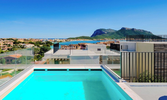 The 2,500sf villa sleeps 8 people and has a private pool and outdoor terraces surrounded by panoramic views of the sea and mountainous Tavolara Island. The villa is equipped with the latest technology smart home with free WiFi, elevator, TVs with satellite and remotely controlled gates.