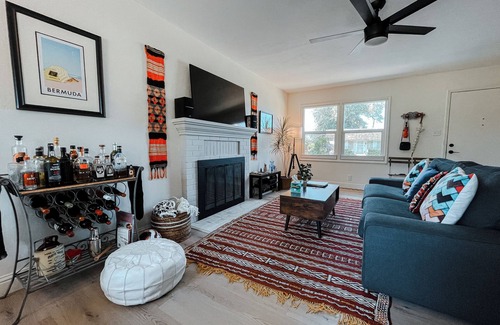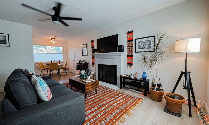 This home offers ample natural light in every room, a comfy living and dining space, two cozy bedrooms with queen beds, an office space with couch, and a spacious backyard.