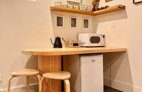 Down a few steps you will enter into your private living space with a kitchenette, living room, bathroom and bedroom. The kitchenette has a microwave, small fridge, water kettle, dishes and a selection of coffee and tea for your convenience. There is no sink, so not a full kitchen and please don't use the bathroom sink as a kitchen sink. The living room has a large couch and TV capable of streaming online (no cable) via Wi-Fi, along with multiple board and card games. Luxurious, large bathroom with dual showerheads, and bidet toilet. We have essentials (shampoo, conditioner and bodywash). In the bedroom, you will find a memory foam mattress queen bed with a closet, dresser, and a full desk complete with screen and docking station ideal for working. Through a sliding door the laundry room is available complete with washer, dryer and drying rack. The space gets great natural light and is very well lit - no one likes a dark basement.