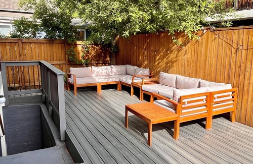 We live upstairs and you may hear us walking or bump into us in the shared backyard. For two week or longer stays, we would coordinate laundry