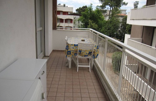Modern flat in Grado Pineta, 2nd floor (no lift), 150m from the beach. Features open kitchen, cozy living room with single sofa bed (with pull-out second single bed), double bedroom, and bathroom with shower. West-facing terrace. Amenities: A/C, washing machine, uncovered private parking, mosquito net in bathroom.