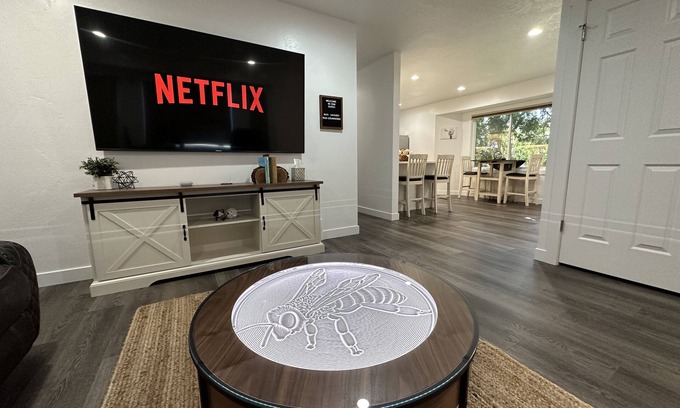 This quiet 2 bedroom(1 king, 1 queen) comes fully loaded with everything you will need to be comfortable while you stay with us. Every room has cellular wireless charging to keep you fully charged whether you’re on the go or here to simply stay in and become hypnotized by our Sisyphus sand table in the living room. The large 75” HD tv is perfect for keeping your guests entertained while food is being prepared in the adjacent kitchen. Blackout curtains in every room will ensure you sleep well and wake refreshed! Every aspect of our VRBO will allow you to feel right at home and have a wonderful next level stay!