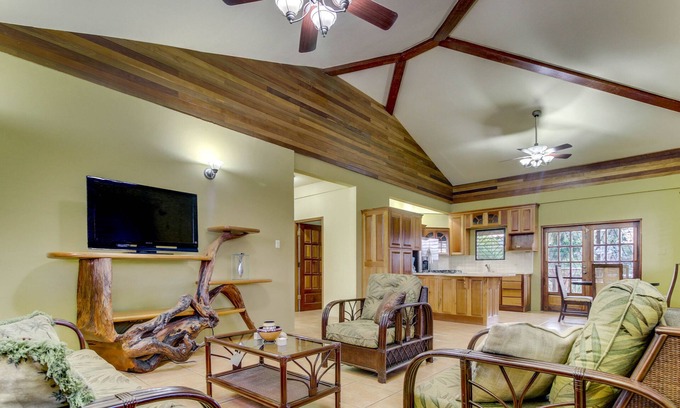 This villa is made up of two parts: a ground-level one-bedroom apartment with a kitchenette, plus an upper-level two-bedroom section with full kitchen and living spaces. Both parts are private and have everything you'll need, and are a fantastic way for everyone to stay close while still maintaining some privacy. The house offers a comfortable atmosphere with spacious rooms and warm wood accents. Gather in the main room and sit on a variety of furniture, drink coffee at a table for four, or watch a VHS from the collection on the flatscreen TV (cable and WiFi included). A second TV makes sure there's no arguing over what to watch. An open kitchen will have you cooking up delicious meals in no time, with all the essentials you'd find at home (please note there is no dishwasher), plus extras like a mixer and coffeemaker. Four will fit around one table in this room, while four more will fit around the table in another room.