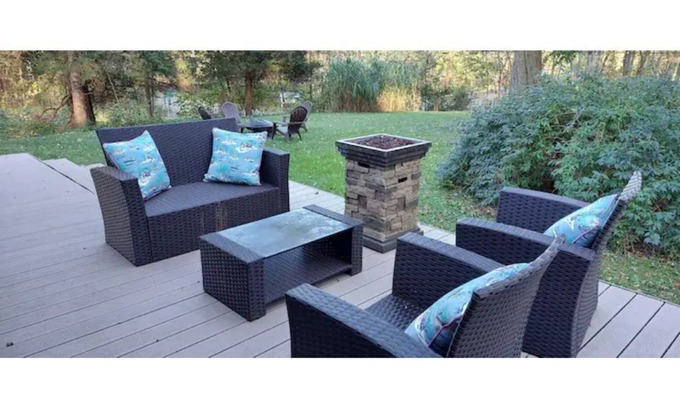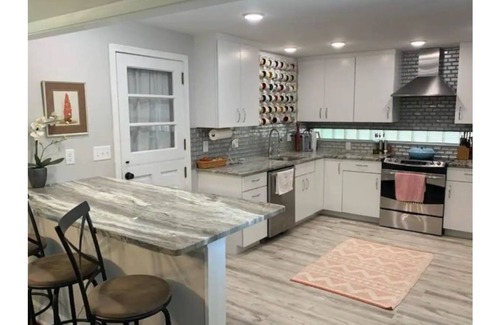 Recently renovated with all needs provided, and then some! Enjoy the fully equipped kitchen, spacious patio, recently renovated bathrooms, and gorgeous family room. There is also a spacious backyard with a beautiful deck. The deck comes equipped with an outdoor heater, outdoor furniture, yard games, a small fire pit, and a hot tub. The hot tub is treated thoroughly before each stay. A large firepit is located in the yard as well. Both bedrooms are located on the same floor, so there is easy access to either. Bedroom 1 includes a vanity cabinet, two nightstands, a large dresser, and an attached bathroom. Bedroom 2 includes one queen bed and one twin bed, along with nightstands. The second bathroom is located off of the kitchen and includes the laundry machines. Both bathrooms feature newly renovated, massive standing showers.