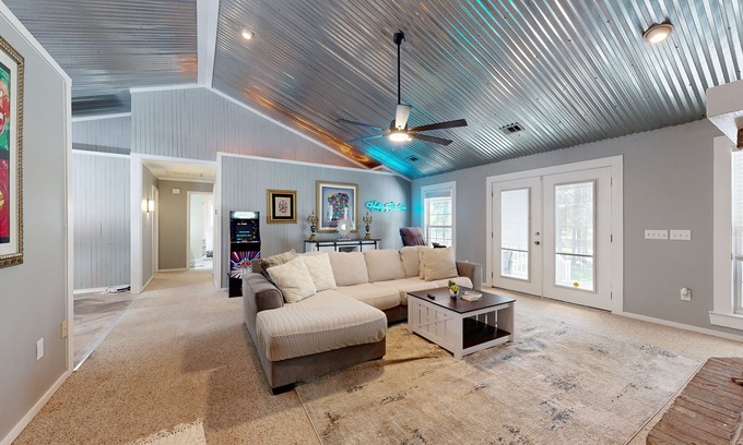 Inside, the living room boasts a classic arcade game and a TV with streaming services, providing entertainment for all ages. With a fireplace, central AC, and a fully equipped kitchen, this home ensures a comfortable and enjoyable stay for all guests. There is a Tesla electric vehicle charger on site.