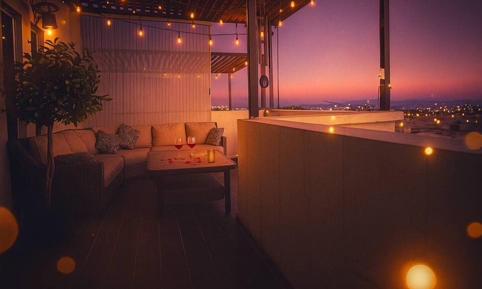 Penthouse terrace with double hammock, sectional sofa, and city & mountain views