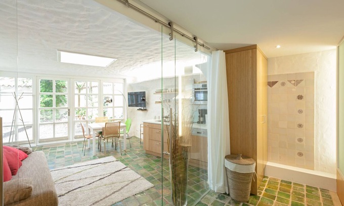 The extraordinary thing about our apartment is that it was built in 2013 in a swimming pool with adjoining conservatory. Both located in the quiet backyard one of the oldest monumental houses Stade, right in the historic center of Stade on the old Hanseatic port. This unusual origin has been lovingly preserved. Of course, your apartment has all the amenities, including a modern, contemporary apartment. Single storey conservatory has been set up as a living area with integrated kitchen. High quality blinds at the revolving wooden lattice windows protect from the sun and enable if necessary complete privacy. Through a glass door you enter the former swimming pool in which a new layer of wood and glass was drafted, on which the designed frosted glass bathroom are on one side of the sleeping area and on the other side. Below this level, new sauna and laundry room with washer and dryer was installed. In sheltered, Mediterranean-style courtyard you with a sunny terrace. Here you will find secure storage for your bikes.