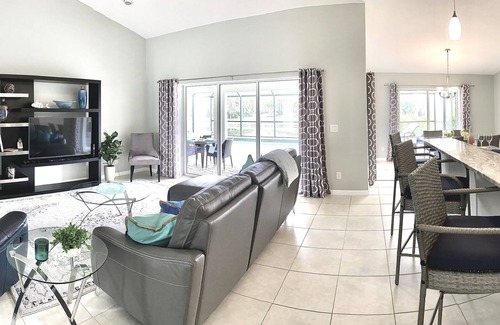 The living/dining/kitchen open concept area is spacious with high ceilings, snack bar and easy living flow and a smart TV. There are 3 sliding doors going out to the over-sized screened patio/pool from the dining and living room areas.