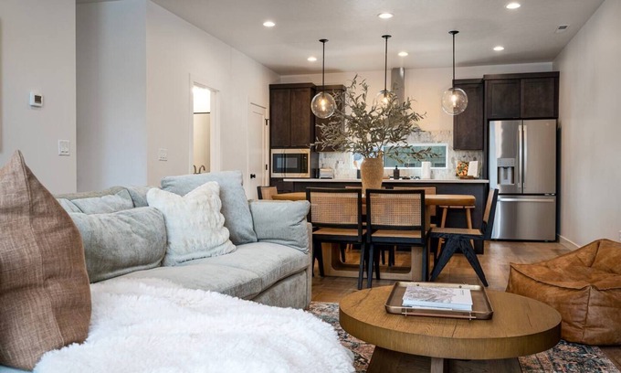 Our townhome is a haven of luxury and comfort, designed to host up to ten guests with ease. Each bedroom is a sanctuary of relaxation, adorned with high-quality linens, pillows, and towels. The living space, illuminated by natural light and mountain views, features a large smart TV and deluxe seating in an inviting open layout. The dining area comfortably seats six, with additional space for four at the kitchen island. Culinary enthusiasts will delight in the fully equipped kitchen, boasting modern appliances, a gas stove, a spacious quartz island, a large fridge, and all the essentials for crafting gourmet dishes.