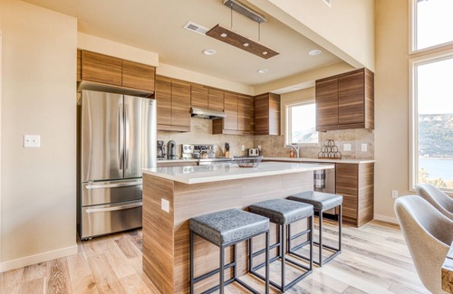 The open great room is ideal for relaxing after fun-filled days, with high ceilings and picture windows. The chef in the group will appreciate the immaculate kitchen with stainless steel appliances and stone countertops. A second living area downstairs presents another cozy spot to unwind for movie nights. There is even a fully-equipped, in-home gym to keep up with your fitness routine. No matter the occasion, this Mosier haven is sure to impress.