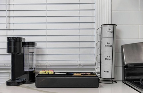 Keurig with K-Cups, sugar, Splenda, and stirrers